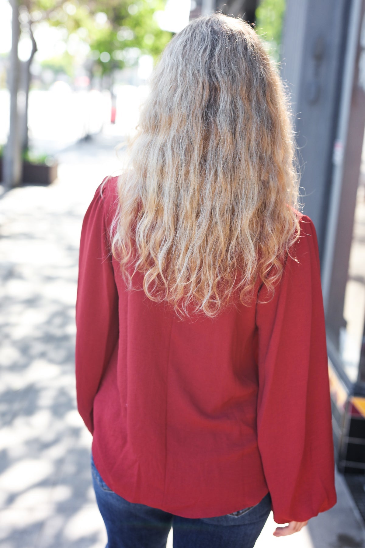 Feeling Femme Off Burgundy Frilled Edge V Neck Tie Top