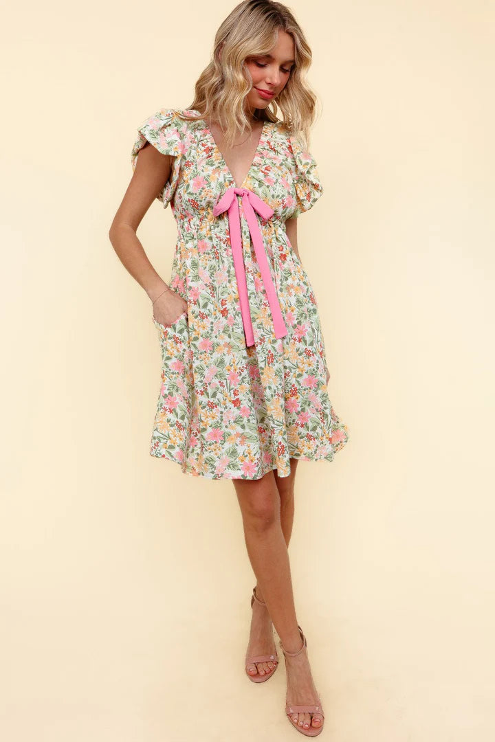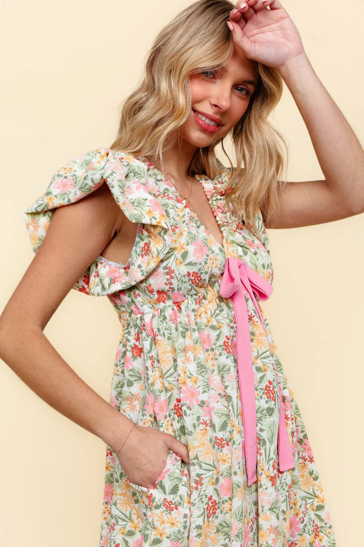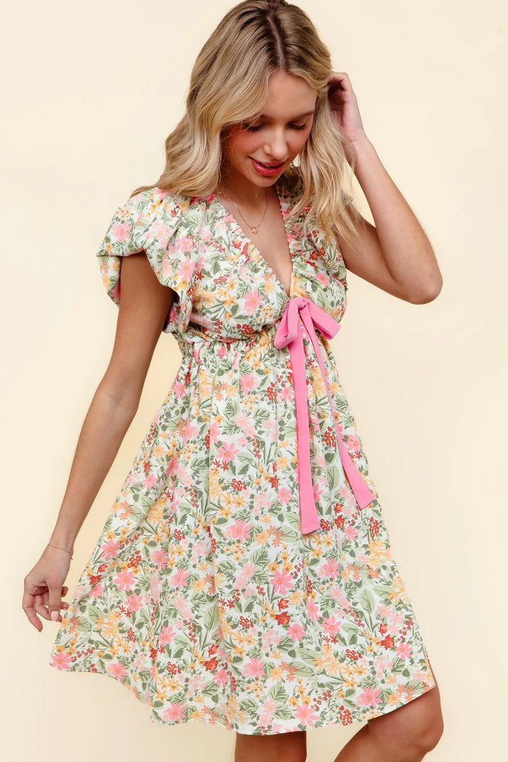 This Floral Ruffle Sleeve Dress is what dreamy days and twirling moments are made of! With a soft pastel floral print, dainty ruffle sleeves, and the sweetest pink bow detail, this dress is perfect for brunch dates, weddings, and all your sunny adventures.